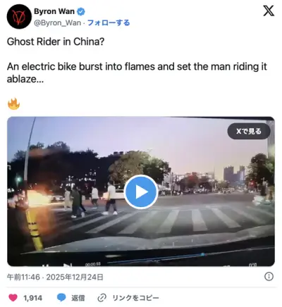 【中国】電動バイクが爆発炎上。乗っていた男性も燃やす💥🛵🕺🔥