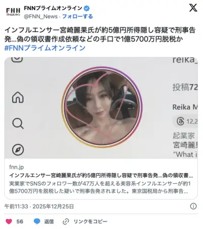 【画像】人気インフルエンサーのカリカリ女子、数億脱税で刑事告発wwwwwwwww