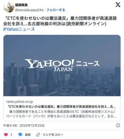 人権も生存権もないヤクザがETCが使えないのは憲法違反と騒ぎ立てる。裁判長「ヤクザに人権はない」