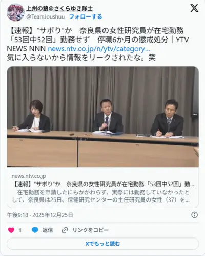 奈良県女性職員、在宅勤務中に外出してアウトドアや飲食店に→通報されるまで県は気付かず 流石奈良