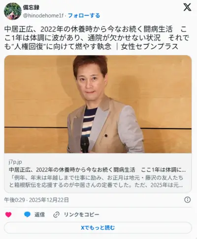 中居正広、2022年の休養時から今なお続く闘病生活 ここ1年は体調に波があり通院が欠かせない状況 「やはりがんだったのでは」との話も