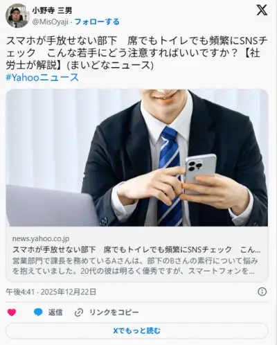 【📱】スマホが手放せない部下 席でもトイレでも頻繁にSNSチェック こんな若手にどう注意すればいいですか?