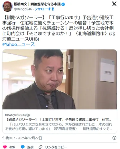【釧路メガソーラー】大阪の日本エコロジー、予告通り建設工事強行 予定地で木の伐採作業始まる…町内会「抗議続ける」