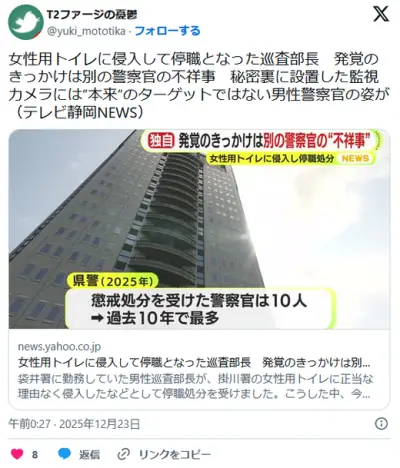 監視カメラでトイレ盗撮の刑事課長を捕える→生理ナプキンを盗む巡査部長の姿まで映る