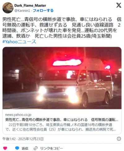 【埼玉】会社員25歳男性死亡…青信号の横断歩道で事故 信号無視の運転手、救護せず ボンネットが壊れた車…運転の20代男逮捕、飲酒か