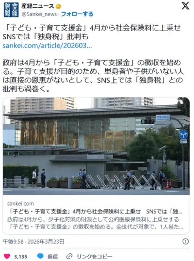 「子ども・子育て支援金」4月から社会保険料に上乗せ SNSでは「独身税」批判も