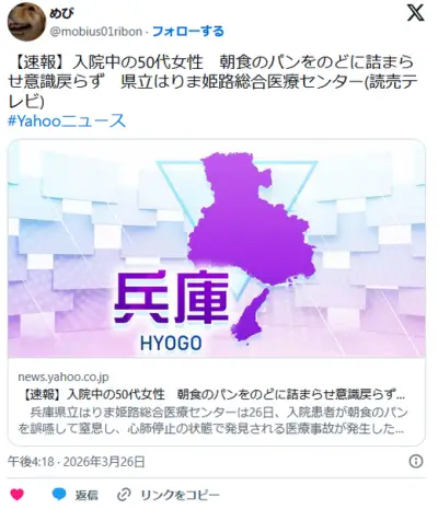 【兵庫】入院中の高次脳機能障害50代女性 朝食のパンをのどに詰まらせ意識戻らず 県立はりま姫路総合医療センター