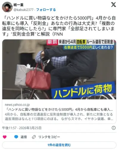 「ハンドルに買い物袋などをかけたら5000円」4月から自転車にも導入「反則金」あなたの行為は大丈夫?
