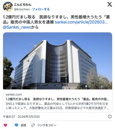 【否認】1.2億円だまし取る 医師なりすまし、男性器増大うたう「薬品」販売の中国人男女を逮捕⋯大阪
