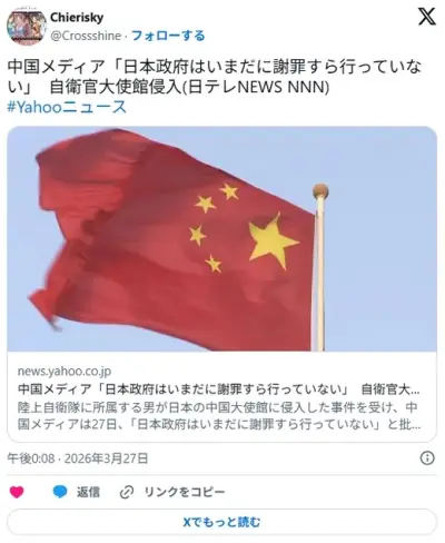 中国メディア「日本政府はいまだに謝罪すら行っていない」 自衛官大使館侵入(日テレ/環球時報)