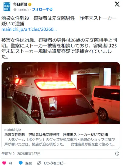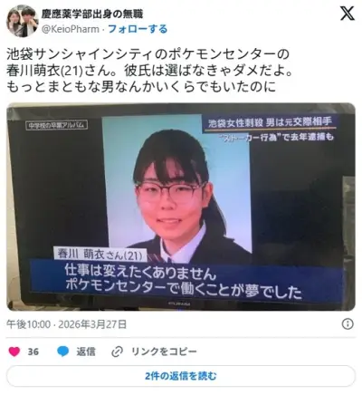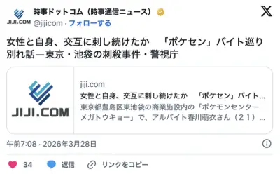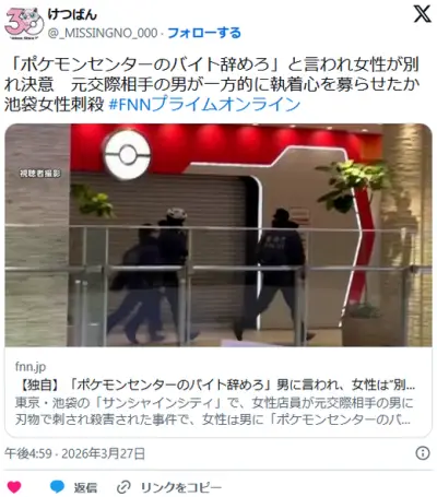 【池袋女性刺殺】「ポケモンセンターのバイト辞めろ」と言われ女性が別れ決意 以前は同じファストフード店で働くも女性はポケセンへ転職