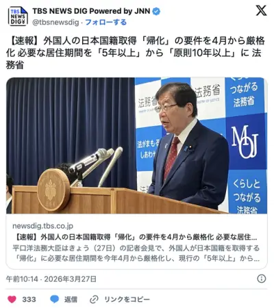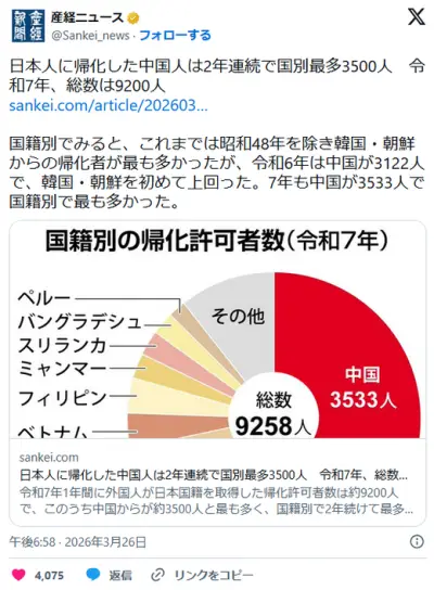 日本人に帰化した中国人は2年連続で国別最多3500人 令和7年、総数は9200人