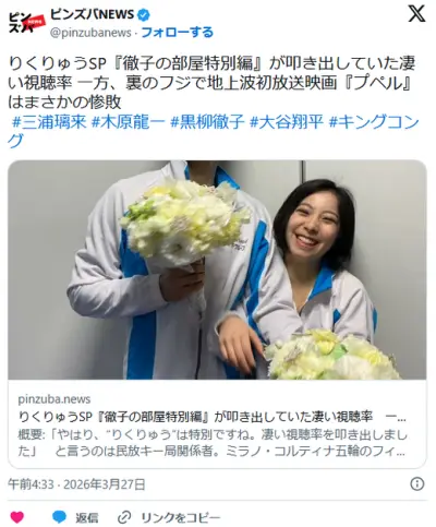 【視聴率】りくりゅう出演の『徹子の部屋特別編』13・3%の高視聴率! 裏番組の西野亮廣『えんとつ町のプペル』2・6%でまさかの惨敗