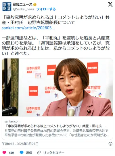 【辺野古】共産党・田村委員長、平和丸船長について「事故究明が求められる以上コメントしようがない」