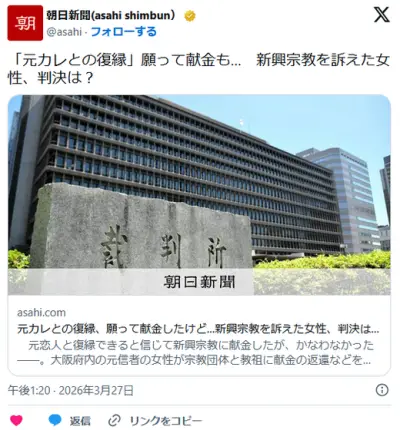 元彼との復縁を信じて「日本で唯一の恋愛成就の大聖天様」に献金した女性、叶わず宗教団体と教祖を訴えた女性、棄却