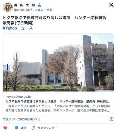 【北海道】ヒグマハンターが逆転勝訴 北海道の取り消し処分は違法 猟銃許可巡り初判断・最高裁