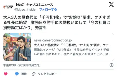 【話題】大人3人の昼食代に「千円札1枚」で“お釣り”要求、ケチすぎる社長に絶望…