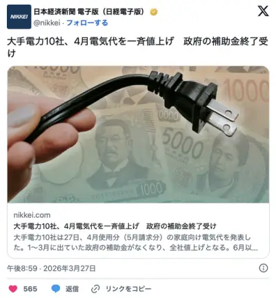 大手電力10社、4月電気代を一斉値上げ 政府の補助金終了受け