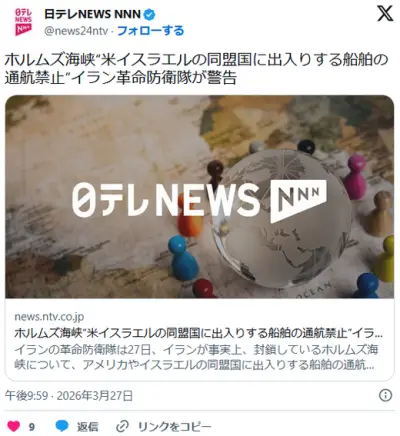 イラン革命防衛隊、米イスラエルの同盟国に出入りする船舶の“ホルムズ海峡通航を禁止”