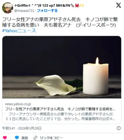 フリー女性アナの栗原アヤ子さん死去 キノコが肺で繁殖する奇病を患い 夫も著名アナ