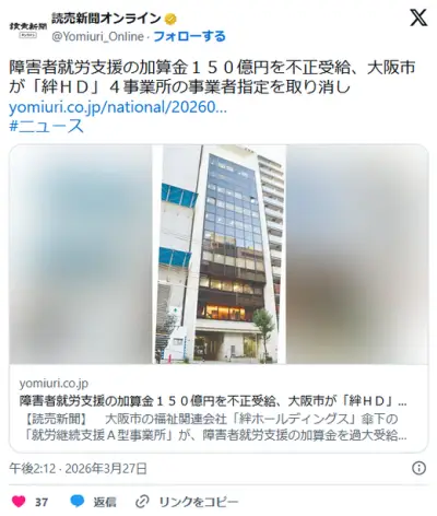 給付金約150億円を不正受給と認定 障害者就労支援「絆HD」を「指定取り消し」