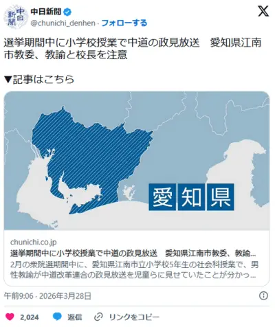 選挙期間中に小学校授業で中道の政見放送 愛知県江南市教委、教諭と校長を注意