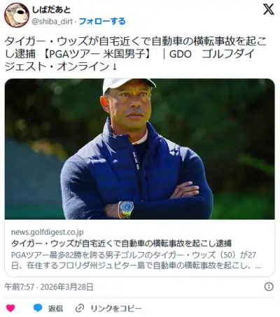 タイガー・ウッズが自宅近くで自動車の横転事故を起こし逮捕