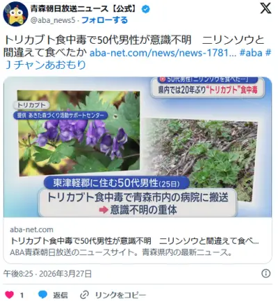 【青森】トリカブト食中毒で50代男性が意識不明 ニリンソウと間違えて食べたか