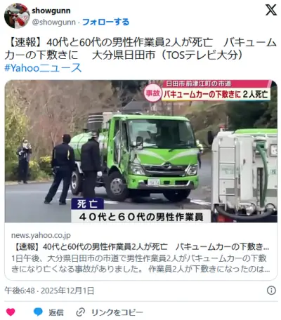 【大分】バキュームカーの下敷きに 男性2人死傷 通りかかった人から通報 日田市の市道