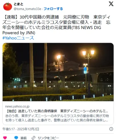 30代の中国籍の男逮捕 東京ディズニーシーのホテルミラコスタ宴会場に刃物持ち侵入、逃走