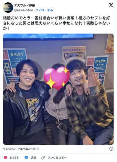 【悲報】オズワルド伊藤「相方のセフレを好きになった男、結婚おめでとう」→炎上