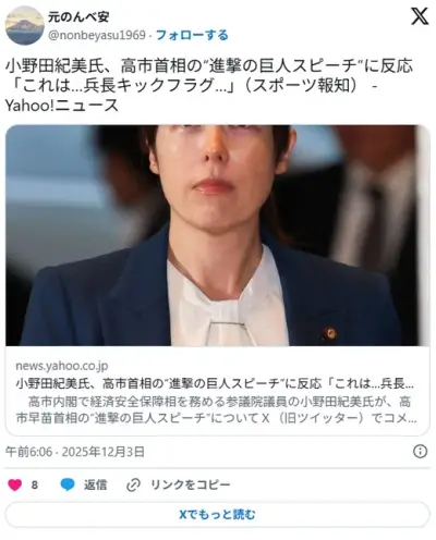 小野田紀美氏、高市首相の“進撃の巨人スピーチ”に反応「これは…兵長キックフラグ…」