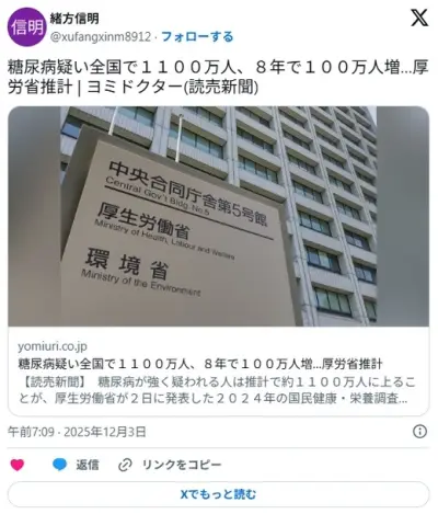 糖尿病疑い全国で1100万人、8年で100万人増…厚労省推計