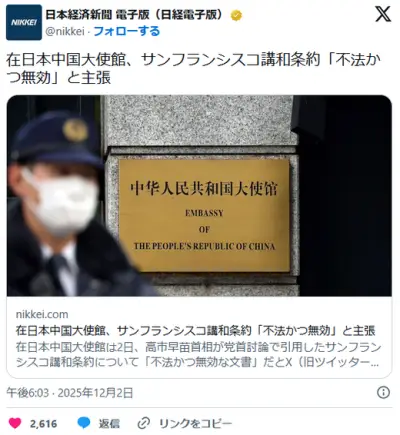 【日中対立】在日本中国大使館、サンフランシスコ講和条約「不法かつ無効な文書」とSNSに投稿 高市首相が党首討論で引用