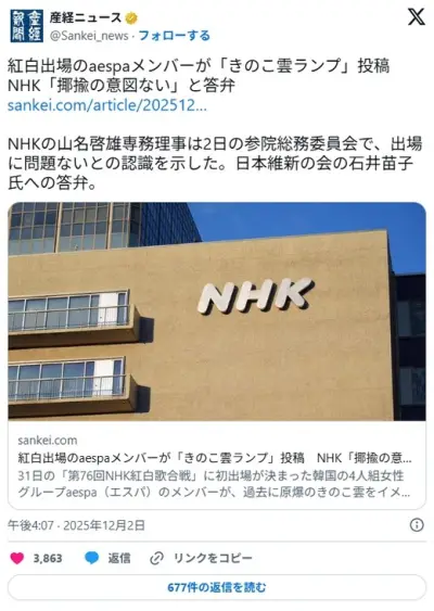 【芸能】紅白出場のaespaメンバーが「原爆のきのこ雲をイメージしたランプ」投稿 NHKが参院総会で「揶揄の意図ない」と答弁