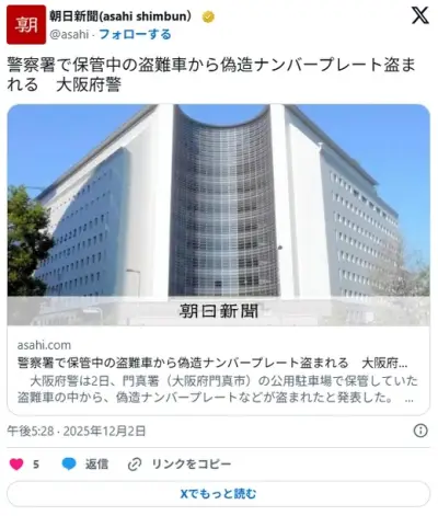 【大阪】警察署で保管中の盗難車から偽造ナンバープレート盗まれる 大阪府警