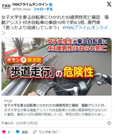 女子大学生乗る自転車にひかれた93歳男性死亡確認 電動アシスト付き自転車の事故10年で約4.5倍