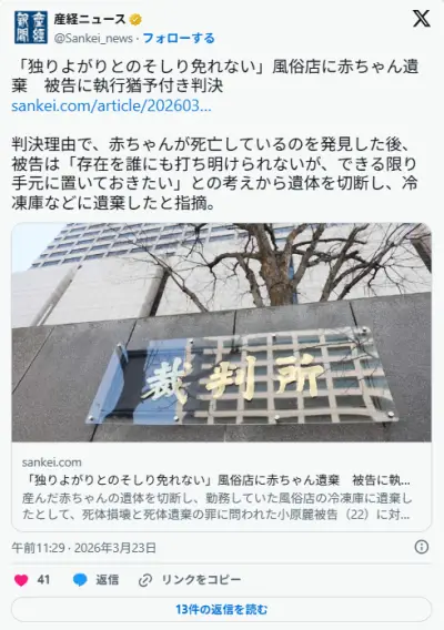 産み落とした赤ちゃんを損壊して冷蔵庫遺棄した風俗嬢小原麗(22)被告に執行猶予判決