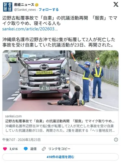 辺野古転覆事故で「自粛」の抗議活動再開 ダンプカーの前で寝そべる人も