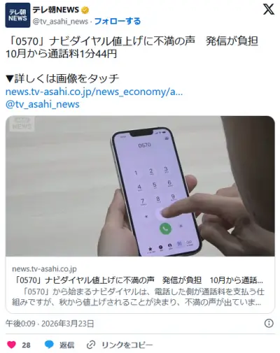 【📞】「0570」ナビダイヤル値上げに不満の声 発信者が負担 10月から通話料1分44円