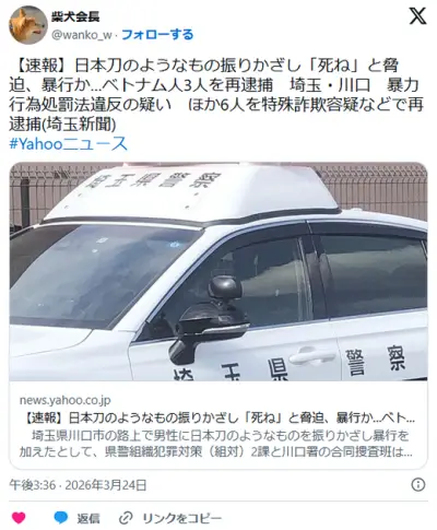【埼玉・川口】日本刀のようなもの振りかざし「死ね」と脅迫、暴行か…ベトナム人3人を再逮捕