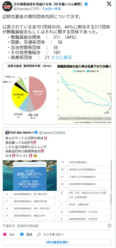 辺野古基金、教職員組合支援が44%で批判集中 事故背景に透明性問う声