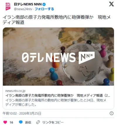 イラン南部の原子力発電所敷地内に砲弾着弾か 現地メディア報道