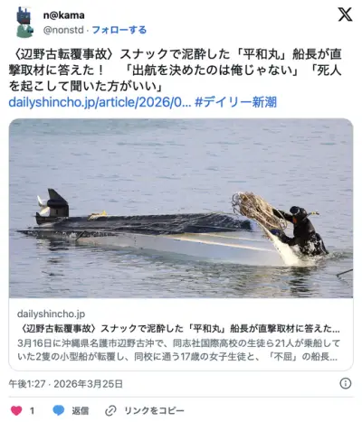 【辺野古転覆】泥酔した平和丸船長「出航を決めたのは俺じゃない」「死人を起こして聞いた方がいい」