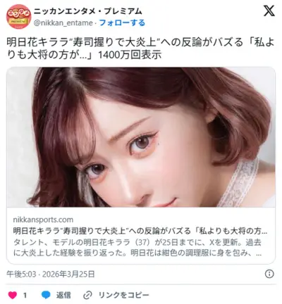 明日花キララ、寿司を握ったら「チンポ握った手で握るな」の声に、「寿司職人の方が握ってる」