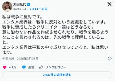 太田光代「『戦争反対』と言うと叩かれる今の世の中は異常。この動きって一体誰が扇動してるの?」