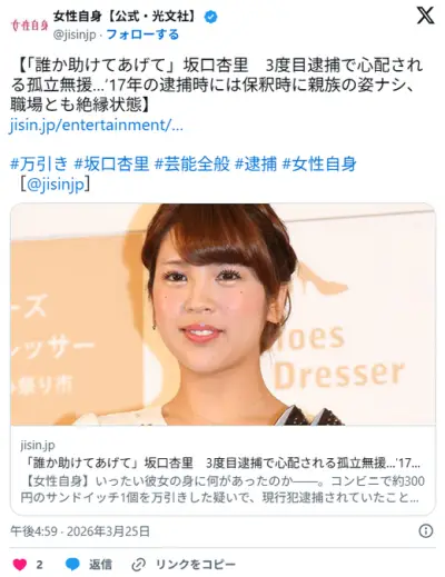 「誰か助けてあげて」 坂口杏里 3度目逮捕で心配される孤立無援…’17年の逮捕時には保釈時に親族の姿ナシ、職場とも絶縁状態