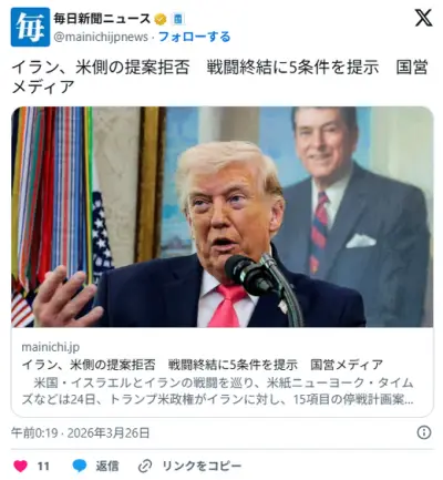 イラン、米側の提案拒否 戦闘終結に5条件を提示 国営メディア