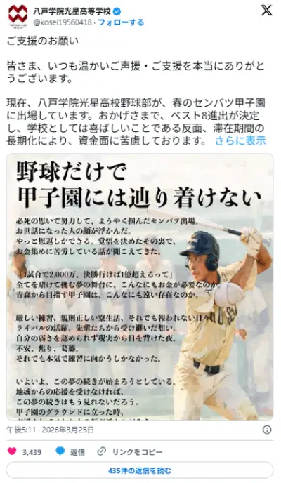 【高校野球】選抜出場校に相次ぐ“資金難” 異例の寄付呼びかけ…「1試合2000万円」の学校も 八戸学院光星や東北などがSNSで