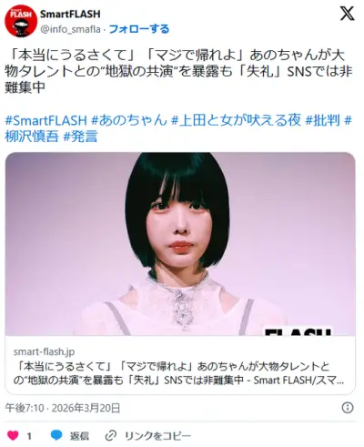 「本当にうるさくて」「マジで帰れよ」 あのちゃん、柳沢慎吾との“地獄の共演”を暴露も「失礼」SNSでは非難集中